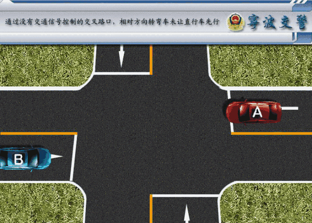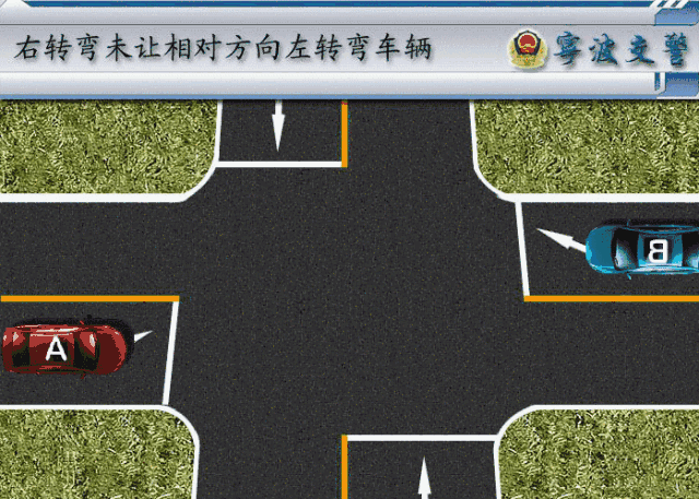 【事故情形】:在沒有交通信號控制的交叉路口,B車右轉彎通過路口時與相對方向左轉彎的A車發生事故。